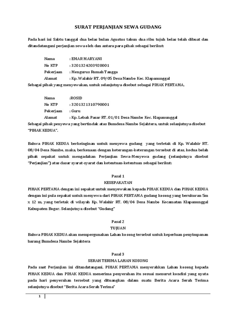 Surat Perjanjian Sewa Tanah from imgv2-1-f.scribdassets.com Dengan adanya surat semacam ini, maka hak dan kewajiban kedua pihak akan terjamin. Surat perjanjian sewa tanah pada dasarnya memiliki poin yang tidak berbeda jauh. Sahabat 99, sebelum mengetahui contoh surat perjanjian tanah maka sebaiknya kamu harus pahami dulu penjelasannya. Contoh surat perjanjian sewa tanah ialah bukti utama yang wajib dimiliki saat melalui proses sewa menyewa sebidang tanah. Pihak kedua berhak sepenuhnya untuk menggunakan tanah yang disewanya dengan perjanjian ini untuk …atas tanggung jawab pihak kedua sendiri. Begitupula dengan penyewaan sawah dan lahan pertanian untuk digarap, pembuatan surat. Tanah wakaf adalah tanah hak milik seseorang yang diwakafkan. Dalam setiap transaksi, pasti ada dua pihak yang terlibat, penjual dan pembeli.